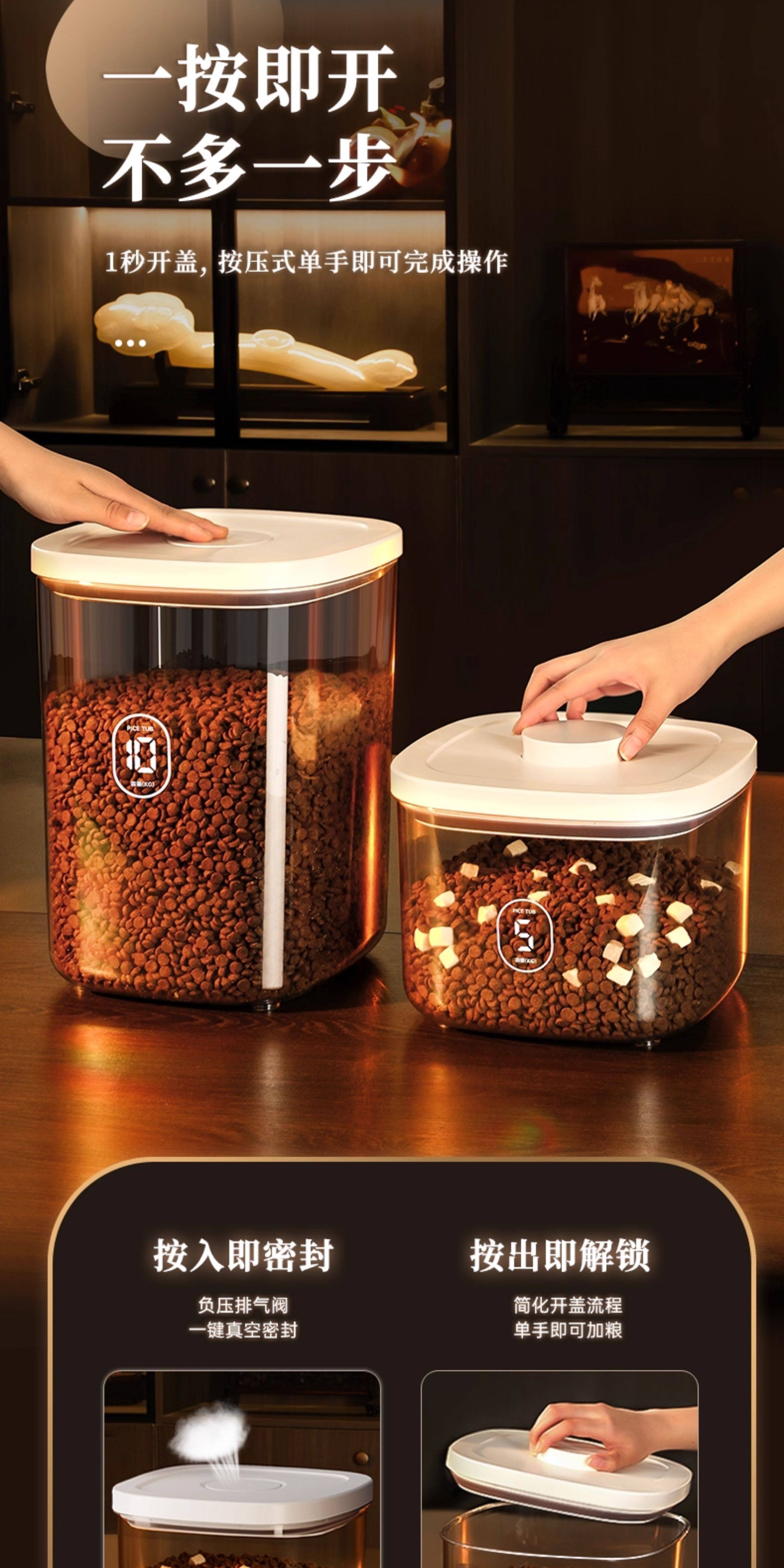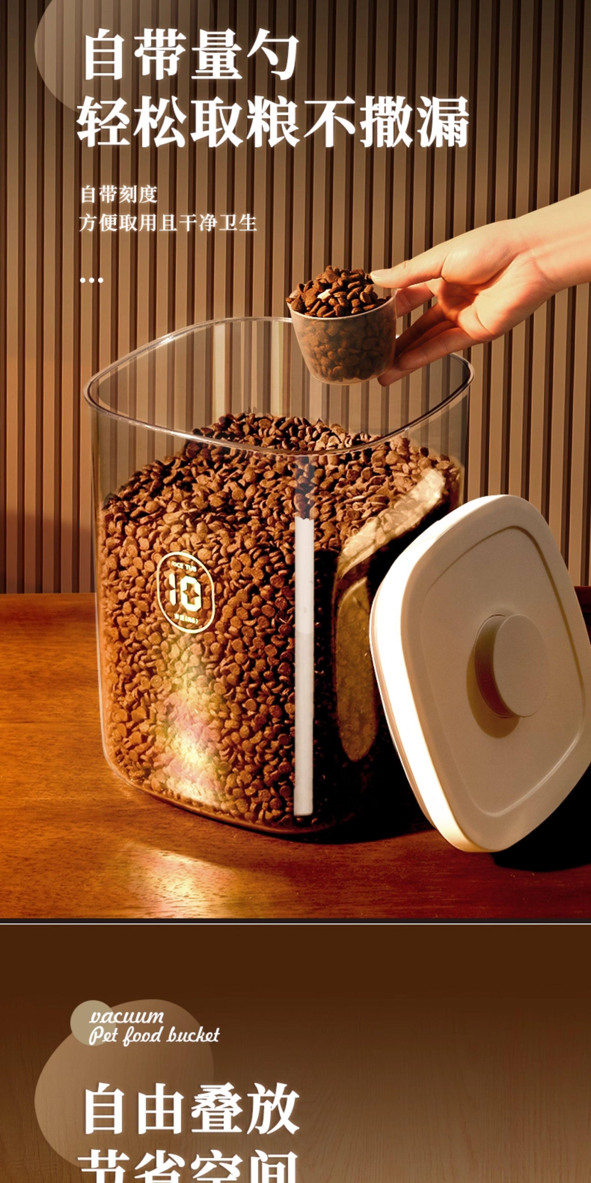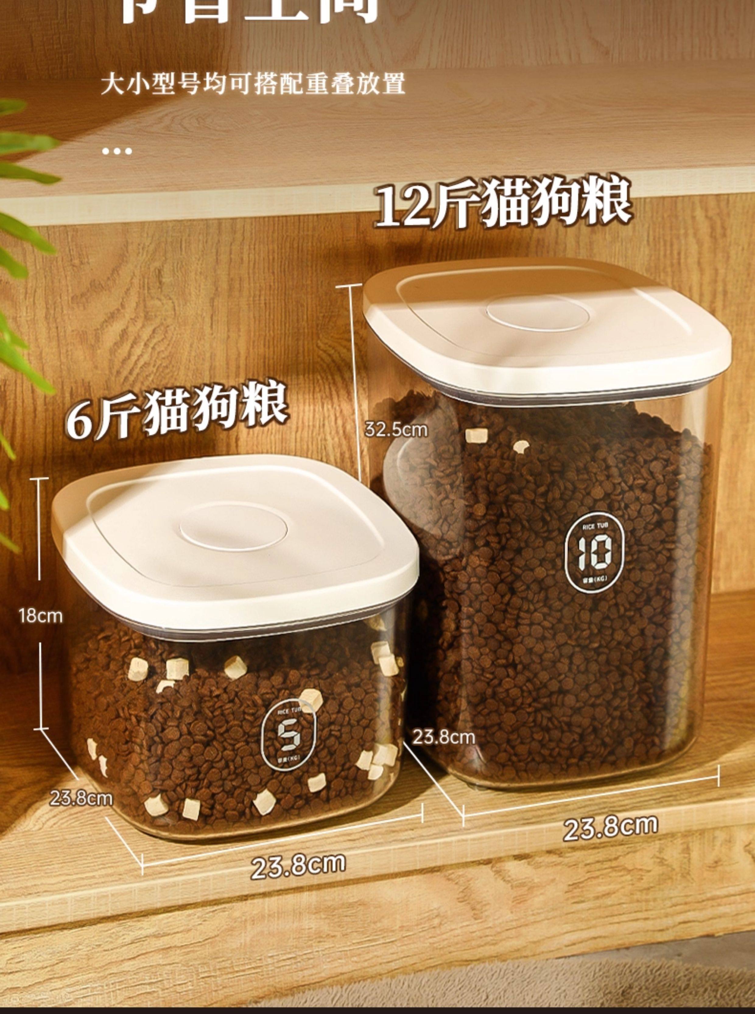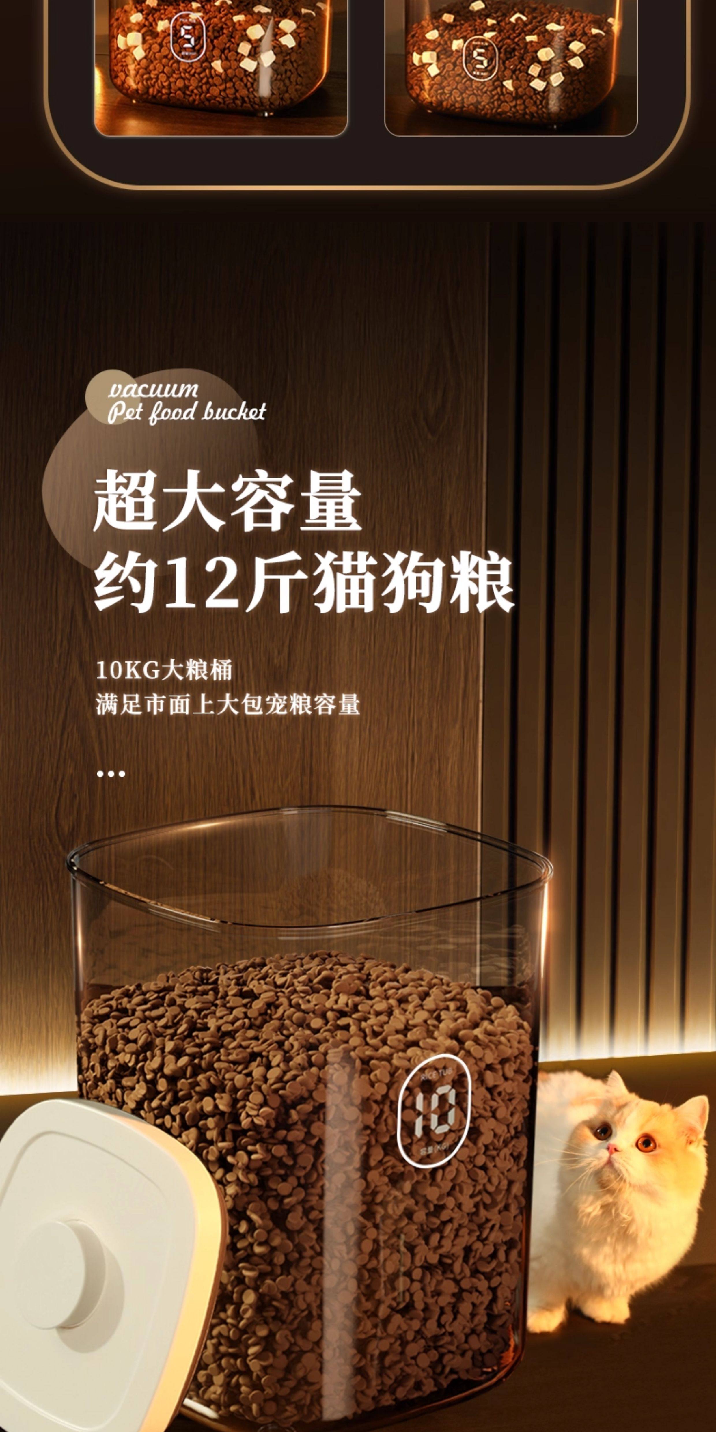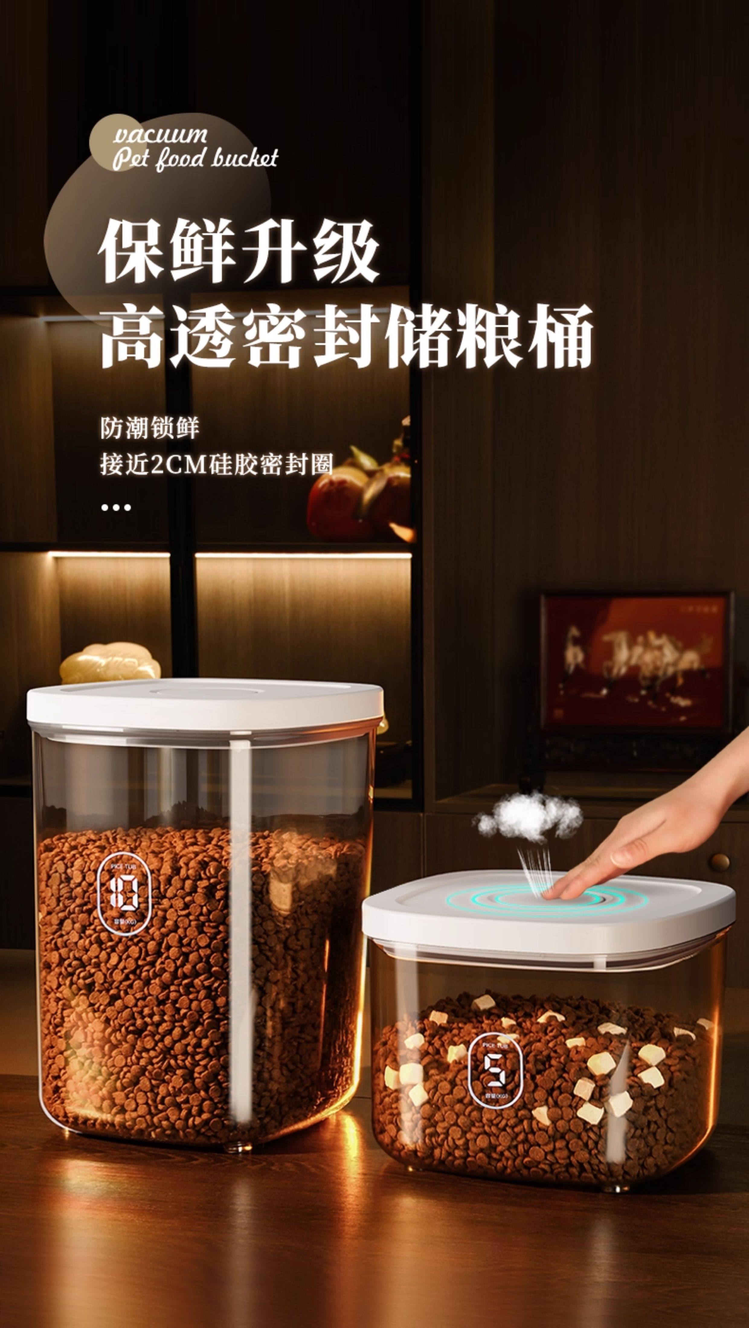 Medium negative pressure sealed storage bucket for cat and dog food weighing about 6 pounds, large negative pressure sealed storage bucket for cat and dog food weighing about 12 pounds, medium negative pressure sealed moisture-proof bucket, 2 boxes of diatomaceous earth desiccant, large negative pressure sealed moisture-proof bucket, 2 boxes of diatomaceous earth desiccant, large negative pressure sealed moisture-proof bucket, and 2 packs of diatomaceous earth desiccant. Electric vacuum sealed medium (cat and dog food weighing about 6 pounds), electric vacuum sealed large (cat and dog food weighing about 12 pounds), medium upgraded brown light proof version storage bucket (cat and dog food weighing about 6 pounds), large upgraded brown light proof version storage bucket (cat and dog food weighing about 12 pounds), large pressure multiple sealing - cat and dog food weighing about 6-8 pounds