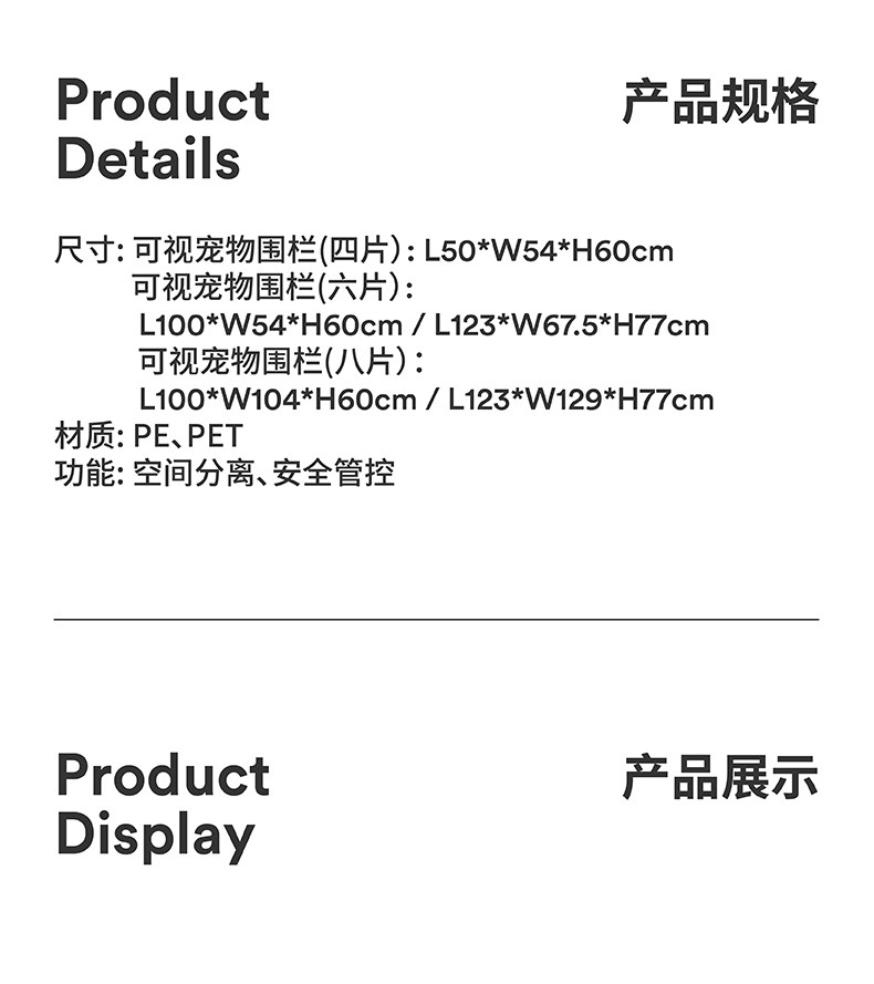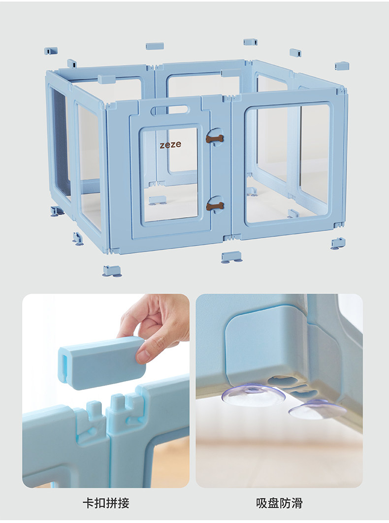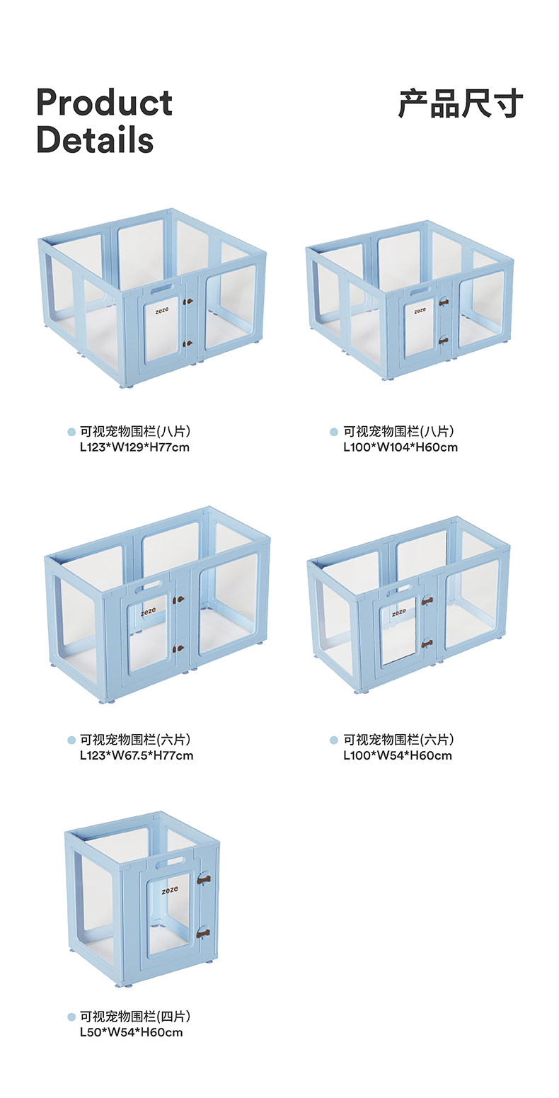 color classification Visible pet fence (four pieces) 50 * 54 * 60cm Visible pet fence (six pieces) 100 * 54 * 60cm Visible pet fence (six pieces) 123 * 67.5 * 77cm Visible pet fence (eight pieces) 100 * 104 * 60cm Visible pet fence (eight pieces) 123 * 129 * 77cm Visible pet fence 10 pieces 150 * 104 * 60cm Visible pet fence 12 pieces 200 * 104 * 60cm Visible pet fence 10 pieces 184 * 129 * 77cm Visible pet fence 12 pieces 246 * 129 * 77cm One bedroom one living room suite 12 pieces 150 * 104 * 60cm One bedroom one living room suite 12 pieces 184 * 127 * 77cm Including floor mat Four pieces of fence+striped floor mat 143 * 88cm Including floor mat Four pieces of fence and six pieces of small fence with ground mat 143 * 88cm+striped ground mat 143 * 88cm+six pieces of small fence with ground mat 143 * 88cm+dotted ground mat 143 * 88cm+six pieces of large fence with ground mat 143 * 150cm+six pieces of large fence with ground mat 143 * 150cm+dotted ground mat 143 * 150cm+eight pieces of small fence with ground mat 143 * 88cm+striped ground mat 143 * 88cm Eight pieces of small fence with ground mat+dot ground mat 143 * 88cm Eight pieces of large fence with ground mat+striped ground mat 143 * 150cm Eight pieces of large fence with ground mat+dot ground mat 143 * 150cm Accessories purchase, please contact customer service